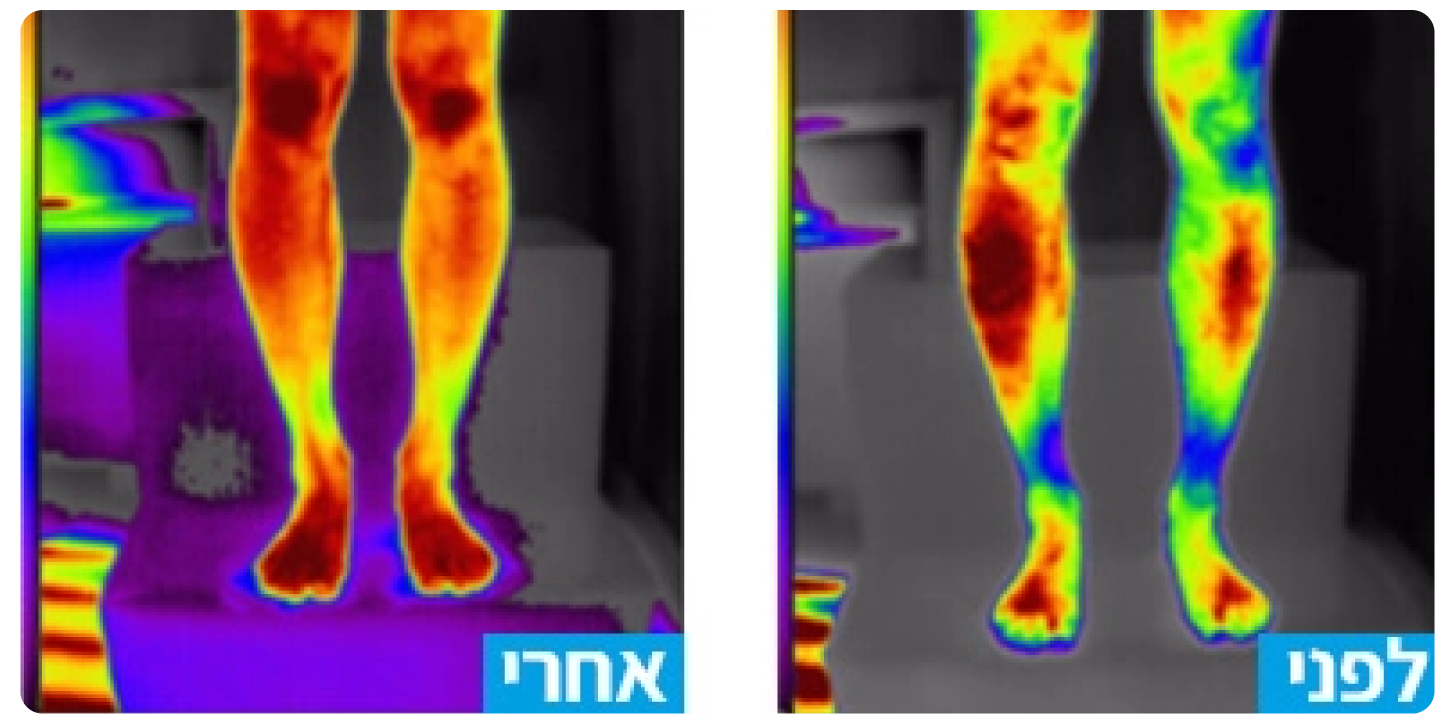 מימין: לפני הטיפול הכתמים הכהים מראים אספקת חמצן חלקית ובכמות מועטה.