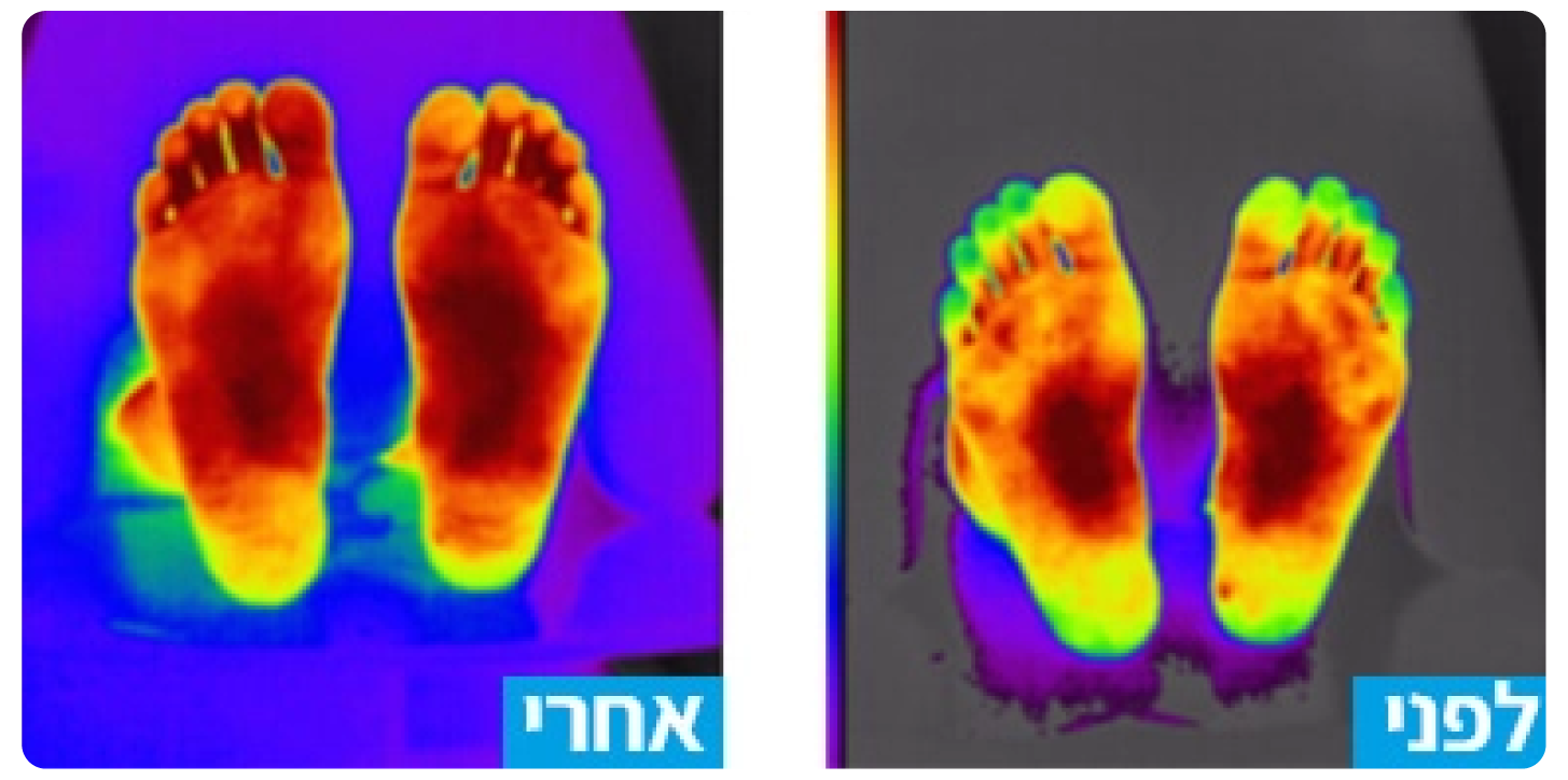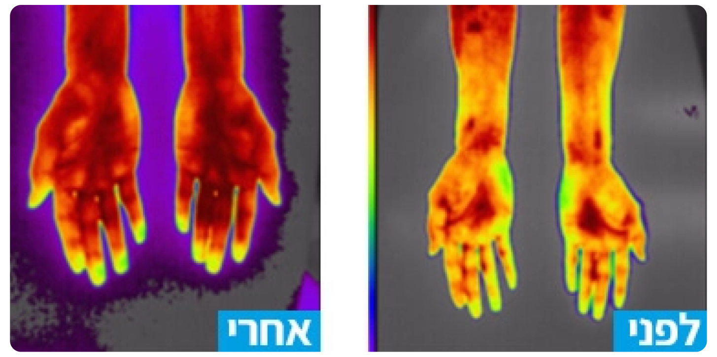 משמאל: אחרי כ- 8 דק של טיפול, הכתמים הכהים מראים אספקת חמצן טובה הרבה יותר.