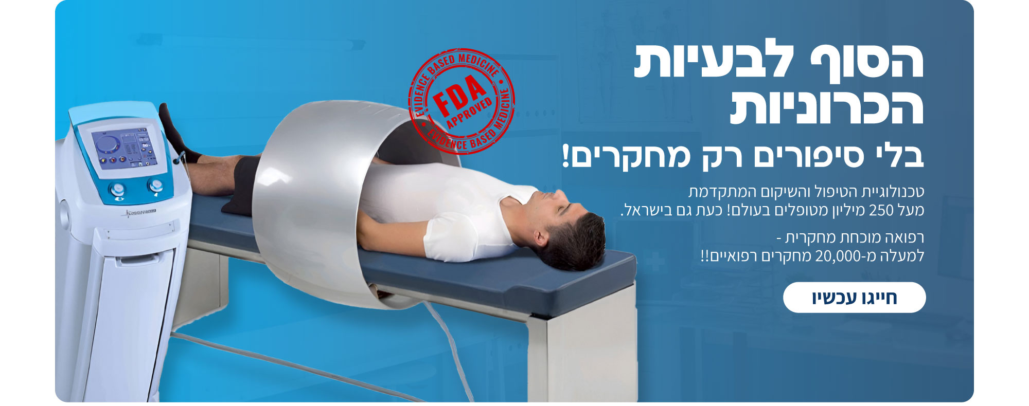 בנוסף, בשונה מטיפולים אחרים למחלות כרוניות, מדובר באחד הטיפולים הייחודיים שאינו רק משכך כאבים ומטפל בסימפטומים, אלא גם מעודד את תאי הגוף לשיקום מלא. הטיפול החדשני לא כולל הרדמה, ניתוחים או נטילת תרופות כלשהן.